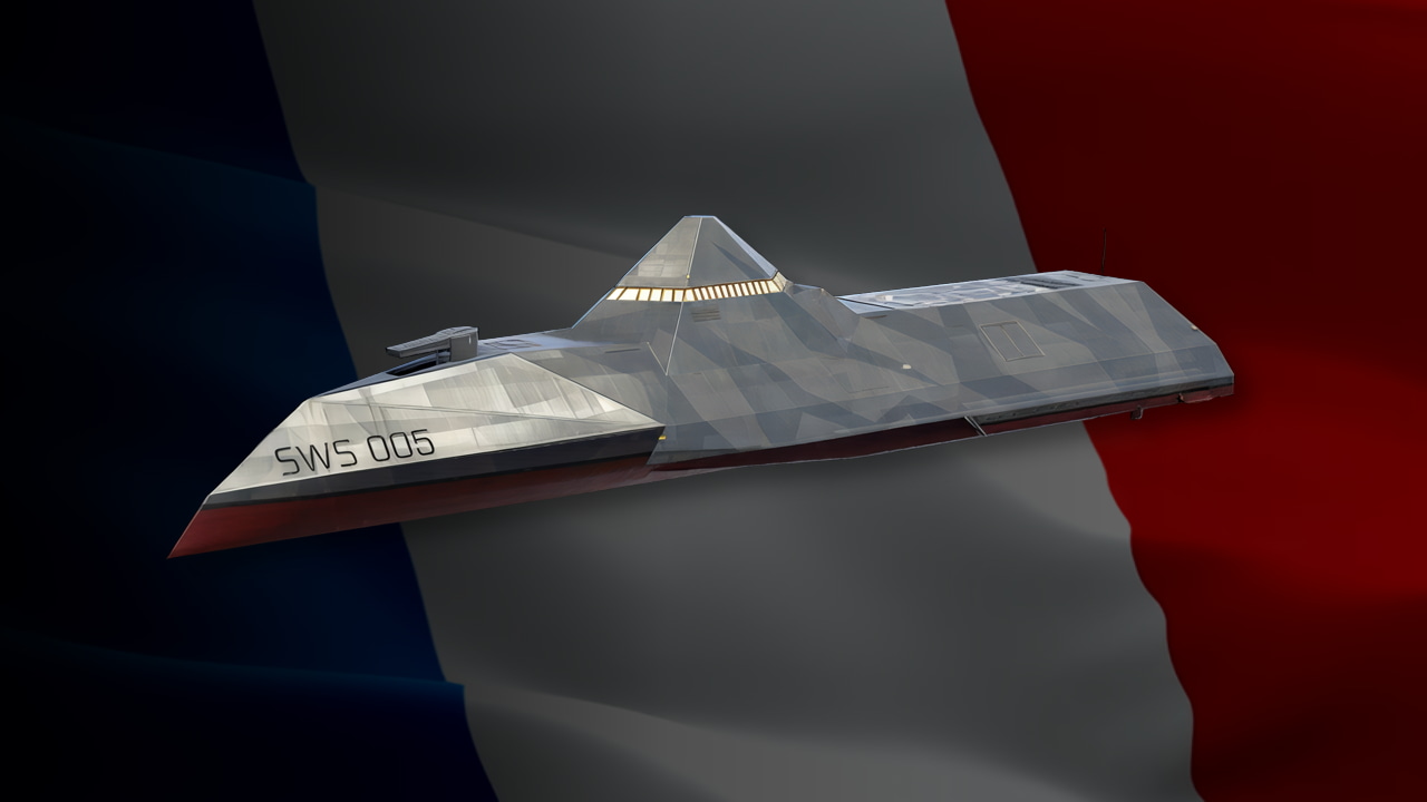 Future French trimaran concept. A pair of high-powered electric propulsion engines and the stealth shape of the ship allow for quick and unexpected strikes, and the armament allows to respond to all threats.